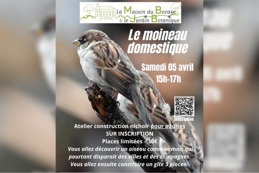 Et ce jusqu’au 31 octobre prochain, du mardi au vendredi de 10h à 18h, les samedis et dimanches et jours fériés, de 14h30 à 18h30. Première animation de la saison : un atelier nichoir pour moineau. Atelier de construction pour adultes samedi 5 avril de 15h à 17h. Tarif 10€. Lien d’inscription à retrouver sur notre site internet. Vous allez découvrir un oiseau commun mais qui pourtant disparaît des villes et des campagnes.Vous allez ensuite construire un gîte 3 places. La maison du bocage se situe au 35 rue Jean-Baptiste Lebas à Sains-du-Nord.