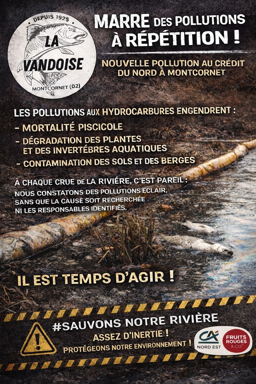 Dans un communiqué, La Vandoise revient sur ses 100 ans d'existence, qui protège la rivière de Montcornet. Mais une nouvelle pollution aux hydrocarbures menace ce milieu fragile. Ces polluants forment un film à la surface, réduisent l’oxygène dans l’eau et mettent en danger poissons, invertébrés et micro-organismes. La disparition récente de la vandoise illustre la fragilité de l’écosystème. Nous refusons que ces pollutions soient minimisées : nous serons vigilants pour défendre notre rivière., conclut l'association.