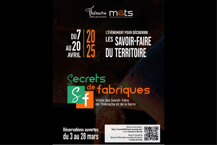 23 entreprises ouvriront leurs portes dans le cadre des Secrets de Fabriques, en collaboration avec l’Office de Tourisme de Thiérache et la Maison des Entreprises de Thiérache et de la Serre. Réservations en ligne sur https://secretsdefabriques.my.canva.site/ ou à l’Office de Tourisme (7 avenue du Préau, Vervins), du lundi au vendredi 9h-12h30 / 14h-17h30. Une initiative de l’Office de Tourisme du Pays de Thiérache et de la Maison des Entreprises de Thiérache et de la Serre.