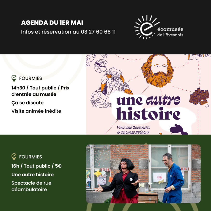 Une après-midi de spectacles pour rendre hommage à la mémoire ouvrière, à l’industrie textile locale... et à celles et ceux qui ont fait vivre cette histoire. Dès 14h30 : Visite animée et costumée menée par deux médiateurs. L’un incarnant un patron de filature, l’autre une ouvrière. Ils partagent leurs points de vue sur le contexte de 1891 qui mènera aux tragiques évènements du 1er mai, à Fourmies. 16h, au départ du château de la Marlière, spectacle de rue déambulatoire "Une autre histoire", celle d’un pèlerinage pour célébrer la venue de Karl Marx en 1847, cette visite du philosophe allemand l’a fortement influencé pour l’écriture du Manifeste du parti communiste. Renseignements / Réservation au 03 27 60 66 11.