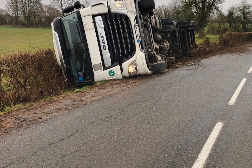 Avesnois : un camion se renverse entre Étrœungt et Rocquigny.