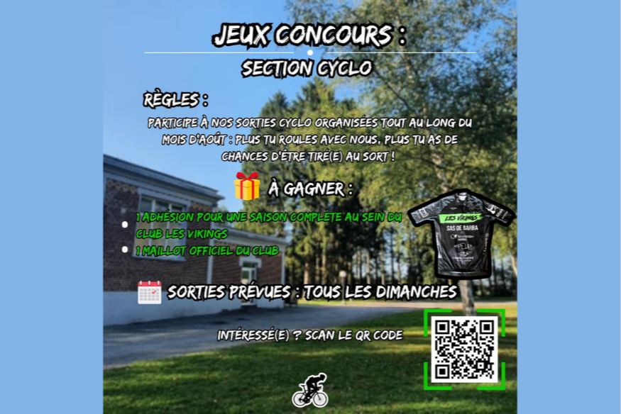 Et si vous rejoigniez un club sportif ou règne une bonne ambiance, dès la rentrée ? Avec une seule adhésion, vous pouvez pratiquer le vélo de route, le VTT, le Gravel, la marche, avec même des compétions possibles. Pour participer et gagner votre adhésion, rendez-vous sur la page Club les Vikings. Il vous suffira de scanner un QR Code sur la publication concernée, l’occasion de repartir également avec le maillot officiel aux couleurs des Vikings.
